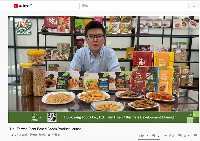 這次參與發表會的有鈺統食品、沅好生技、新食成、齋滋味、弘陽食品及保利美共6家業者,向日本、韓國、澳洲、美國、加拿大、德國等15國買主介紹新產品。本次特色產品有蔬食荷包蛋、植物肉堡排、植物絞肉、三杯雞料理包、蔬食炸蝦、黑胡椒肉醬拌麵等多樣化植物性產品,含有豐富蛋白質又兼顧健康及環保的食品。本次發表會以英日語雙頻道播出,成功吸引重要買主如日商YOUKI、香港高檔超市City’Super、美商Cedarlane Natural Foods、Ballyplus、澳商Bio Health Pharmaceuticals等200位買主參加。