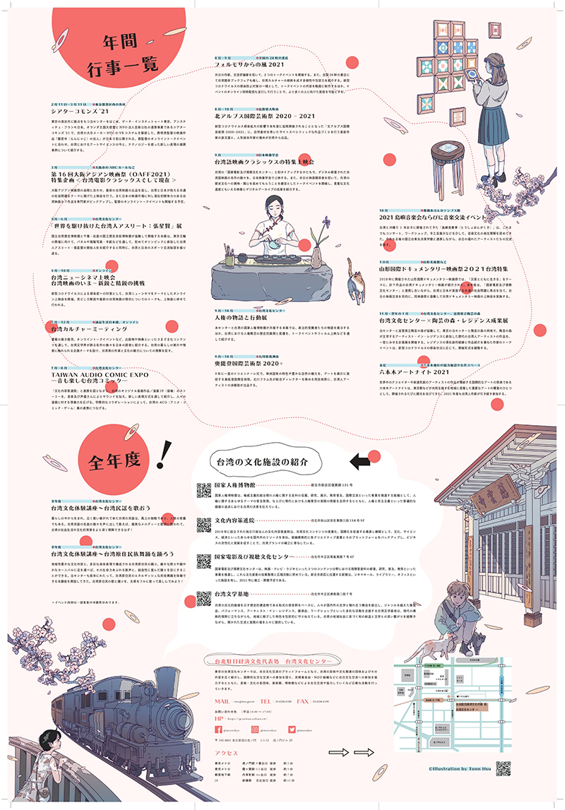 今年臺灣文化中心邀請近期因「一Tonn防疫美勞教室」廣受矚目的臺灣插畫家許彤,以阿里山為主視覺,搭配茶道、花磚、原住民族、寺廟及火車等臺灣文化意象元素繪製摺頁。沿續去年隱藏小彩蛋的創意,本年度摺頁也暗藏許多美麗的臺灣意象巧思,等待大家去仔細尋找。