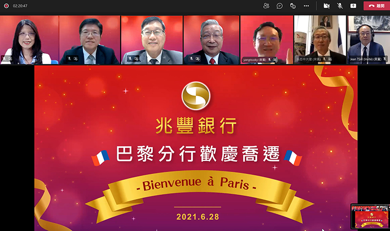 【臺北訊】兆豐銀行巴黎分行為利業務轉型,拓展國際聯貸業務,加深與金融同業合作,行舍由巴黎市區遷址至巴黎西郊LA DEFENSE金融區,法國時間2021年6月28日上午9時正式喬遷營業。受疫情影響,改以視訊方式舉行線上開幕儀式,由兆豐銀行張董事長兆順主持,胡常務董事光華、蔡總經理永義、蕭副總經理玉美,及貴賓僑務委員會童委員長振源、駐法大使吳代表志中、巴黎台貿中心蕭主任淑禧、世界台灣商會蔡前總會長國泰、歐洲台灣商會林總會長奇雋等共同參與。