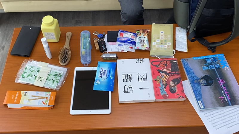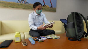 劉櫂豪特別介紹太太子煊買的台鐵EMU900電聯車造型的紀念鑰匙圈一卡通,同時也不忘提醒自己未來EMU3000新型城際列車上路時,也要爭取台鐵發行有特色的紀念品,讓鐵道迷及有興趣的遊客收藏。另外劉櫂豪也從背包中掏出日常用品梳子、酒精、紙巾、牙刷、IPAD、小點心,和太太準備的保養品,從這些用品看出夫妻間的愛心,還有劉櫂豪對防疫新生活的落實,劉櫂豪特別推薦林務局發行的口罩,印有台東特有種植物,既有特色又美觀。最後也趁介紹背包時,順便整理早已吃完忘記丟掉的餅乾盒。