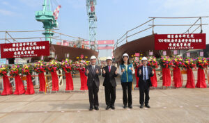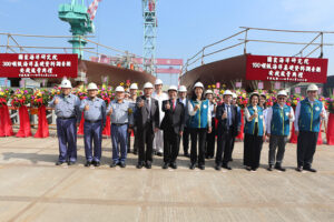 【高雄訊】台灣國際造船股份有限公司(以下簡稱:台船公司,股號2208)承造海洋委員會國家海洋研究院100噸級與300噸級海洋基礎資料調查船各1艘,於今(22)日上午吉時假台船公司高雄廠區,並由台船公司蔡坤宗總經理,及海洋委員會國家海洋研究院陳璋玲院長,共同主持兩型船安放龍骨祈福儀式,祈求建造順利,人員平安。