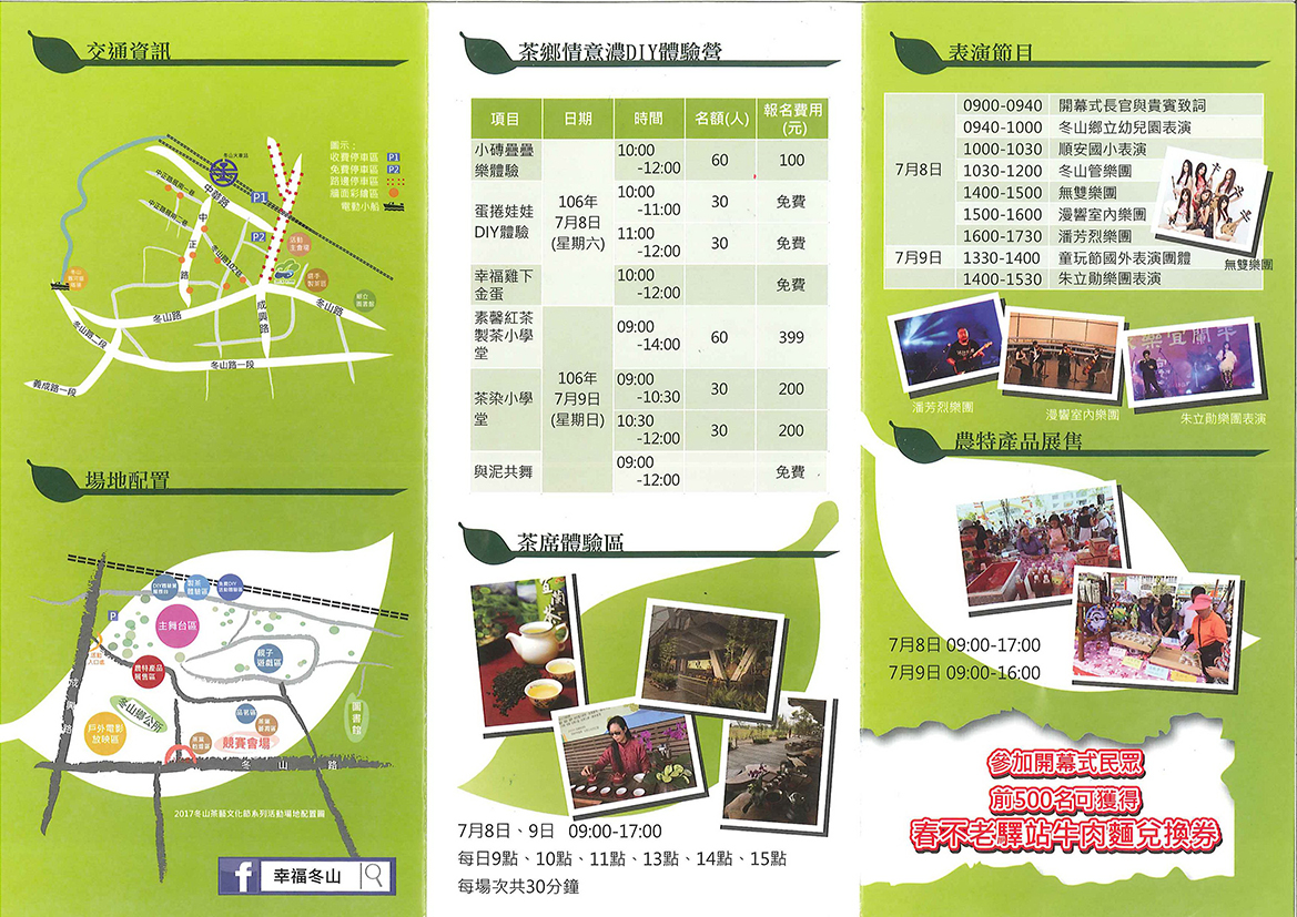 另外各政府機關也配合於活動期間辦理各項宣導活動,如冬山鄉公所清潔隊於8日晚間17-19時辦理資源回收宣導送好禮、冬山鄉衛生所於9日辦理健康保健宣導提供免費口腔黏膜檢查及贈送精美贈品,各項系列活動內容豐富,歡迎您攜家帶眷、扶老攜幼踴躍參與。