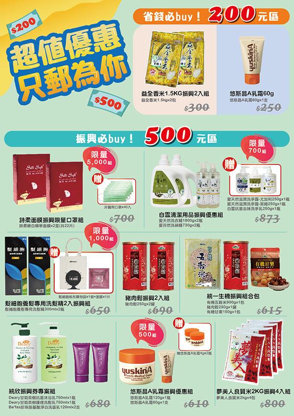 中華郵政公司表示,為回饋民眾,特與國內知名廠商聯合企劃,配合振興券使用期限及面額,於109年7月15日起至12月31日止推出限量15,000組之「振興優惠2倍包(200元)」及5,000組之「振興優惠2倍包(500元)」,商品多為獲官方認證之民生用品,售完為止。