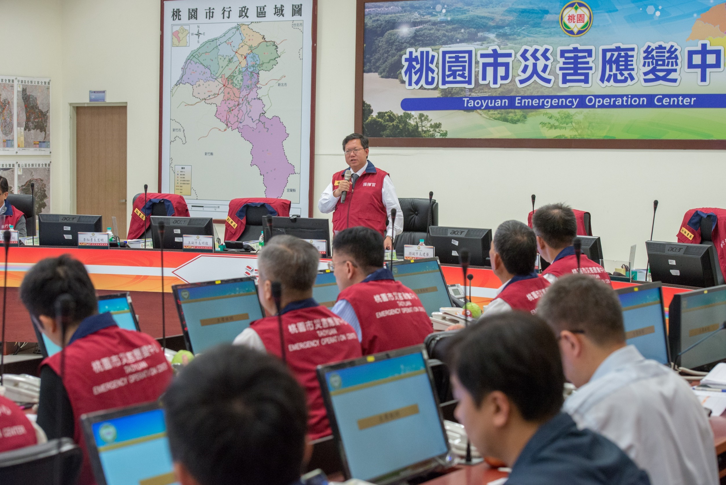 鄭市長說,根據中央氣象局預報資料,颱風預估帶來平均風力最大為9級、陣風最大為13級,山區部分可達大豪雨等級降雨(24小時累積雨量400毫米),平地部分亦有大雨至豪雨等級雨勢(24小時累積雨量300毫米),包括桃園區、蘆竹區、大園區、新屋區及觀音區等為淹水高風險重點區域,復興區則為坡地致災高風險區。