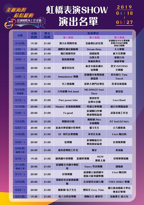 2019澎湖國際海上花火節各項活動詳情請上FB搜尋「澎湖國際花火節」或「澎湖逍遙遊」。