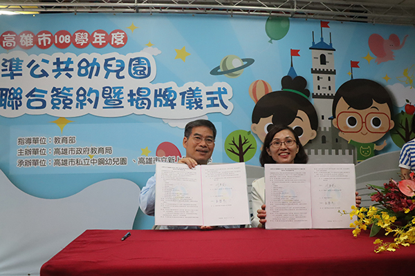 【高雄訊】中鋼幼兒園今天(26日)舉行準公共幼兒園簽約暨揭牌儀式,由高雄市教育局副局長黃盟惠、中鋼幼兒園董事長林美龍代表完成簽署;高雄市加入準公共機制幼兒園已達到120所,居全國之冠,提供超過15,335個名額,幼兒每月負擔不超過4,500元,其餘費用由政府負擔,減輕家長育兒負擔,於108學年度高雄市平價教保服務供應量將達5成。