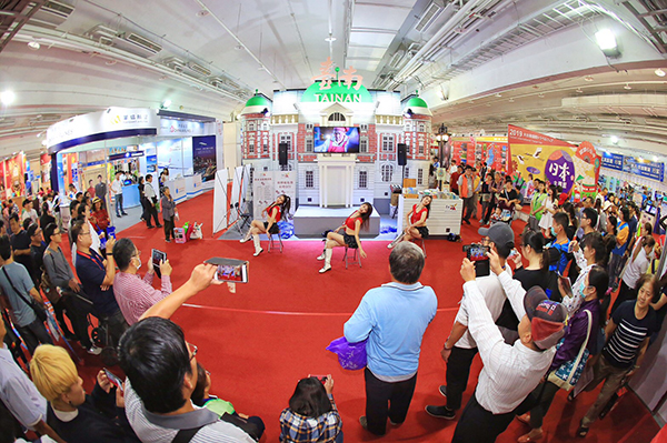 臺南館在活力四射的東方藝術團演出下揭開序幕,觀光大使「魚頭君」及「蟋帥君」也一起現身旅展,齊心齊力行銷臺南,民眾只要參加「臺南尚蓋讚」活動就送臺南在地插畫家「Marco」所設計的L夾(數量有限),現場也提供免費「劍獅鑰匙圈彩繪DIY」體驗活動(現場報名,名額有限),活動詳情可至臺南館服務台洽詢。