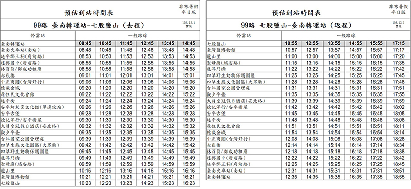 台灣好行99安平台江線自台南轉運站發車,行經孔廟、林百貨、赤嵌樓…等舊市區景點,並串連至億載金城、安平古堡、安平樹屋、四草大眾廟、台江國家公園管理處、鹽博物館、七股鹽山…等安平、七股區域重要景點,增開班次後並配合調整時間,去程台南轉運站發車自8:45起,末班車14:45,返程七股鹽山發車自10:55起,末班車17:15,詳細資訊可透過以下多種管道查詢,「大台南公車」APP,「大台南公車」網站(http://2384.tainan.gov.tw)及「台灣好行」官網(https://www.taiwantrip.com.tw/),或撥打公車語音查詢電話:(06)2998484(我坐坐巴士巴士),由專人服務查詢公車動態及替代搭乘路線,或至本市各旅遊服務中心,由專業的旅遊服務人員協助提供88、99線觀光公車等旅遊資訊,歡迎遊客多加利用。