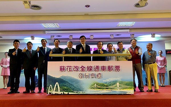 圖:郵票揭幕儀式,左起:泛亞工程建設公司張子文總經理、中華集郵團體聯合會林茂興理事長、中央印製廠鄧延達總經理、中華郵政公司郭純陽副總經理、交通部郵電司王廷俊司長、中華郵政公司吳宏謀董事長、交通部公路總局陳彥伯局長、蘇花公路改善工程處邵厚潔處長、中興工程顧問公司陳伸賢董事長、台灣世?工程顧問公司李元唐副總經理、榮工工程公司曾國基總經理。