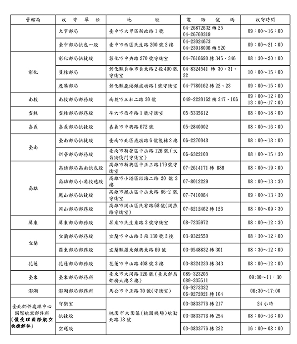 連續假期期間停止收攬信筒(箱)郵件及投遞包裹、限時、普通郵件,惟為因應顧客交寄快捷郵件需求,仍照常投遞快捷郵件,並開放全臺郵局郵務科(快捷股)及駐有守衛或保全之郵局郵務股,收寄國內、國際快捷郵件;另臺北郵件處理中心航郵科國際快捷郵件股及空運股(地址:桃園市大園區航勤北路18號)亦提供收寄國際快捷郵件服務。
