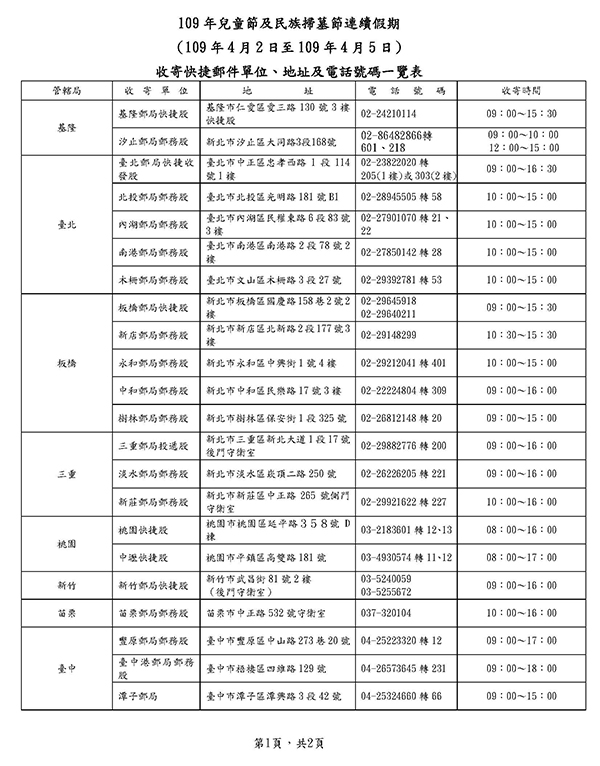 【臺北訊】109年4月2日至4月5日兒童節及民族掃墓節連續假期,各地郵局營業窗口僅臺北故宮郵局營業,提供外幣兌換、各類集郵票品與代售商品販售服務,其餘郵局一律停止營業。