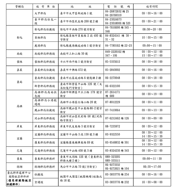 連續假期期間停止收攬信筒(箱)郵件及投遞包裹、限時、普通郵件,惟為因應顧客交寄快捷郵件需求,仍照常投遞快捷郵件,並開放全臺郵局郵務科(快捷股)及駐有守衛或保全之郵局郵務股,收寄國內、國際快捷郵件;另臺北郵件處理中心航郵科國際快捷郵件股及空運股(地址:桃園市大園區航勤北路18號)亦提供收寄國際快捷郵件服務。
