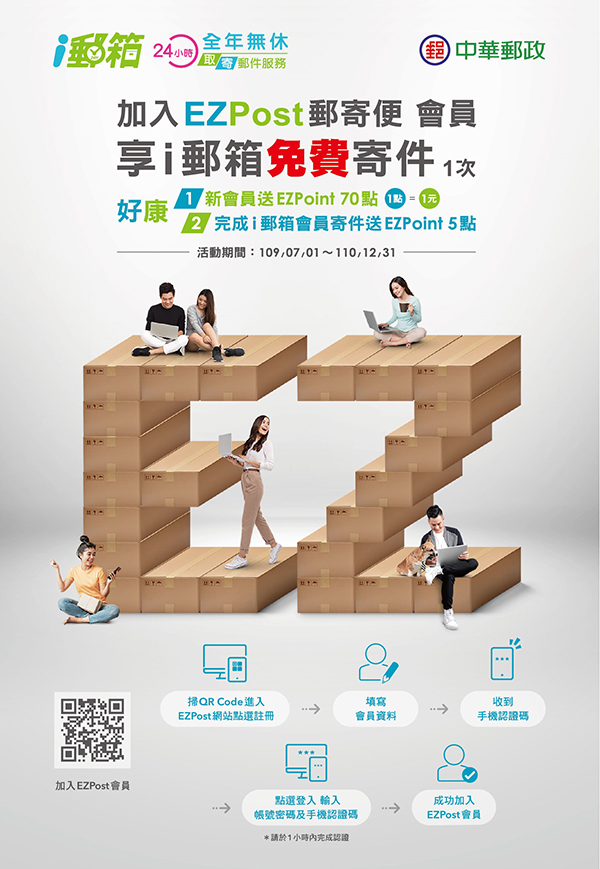 又為鼓勵民眾體驗「i郵箱」自助寄件服務,中華郵政公司現正舉辦EZPost(郵寄便網站)會員募集積點回饋活動,凡於110年12月31日前加入該網站的新會員,可獲贈EZPoint 70點(1點等同1元),即享有免費寄件1次機會,後續會員於「i郵箱」寄件成功,每筆可另得EZPoint 5點回饋。使用「i郵箱」寄件手續極為簡易,只要預先登入EZPost網站,輸入收、寄件人資訊,取得一組郵件號碼及4位數的驗證碼後,將郵件封裝完妥,即可隨時至「i郵箱」寄件,不受郵局營業時間限制。