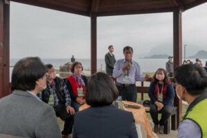 總統抵達後,先聽取林務局長林華慶等有關漁具、海洋生物手工編織物及周遭海岸生態景觀介紹,並於涼亭內聽取船長林新永從事漁業工作及海洋保育心得分享,以及欣賞船長林福蔭朗誦詩文創作。