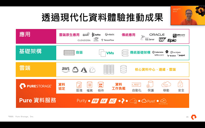 Pure Storage重新定義了多雲環境和雲端原生應用的儲存風貌,消除傳統基礎架構面臨的挑戰,如資料孤島和供應商鎖定等問題,藉由現代化資料體驗幫助客戶獲得最佳容器編排(Container orchestration)、資料移動性(Global data mobility)和彈性的使用即服務(As-a-service consumption),透過AWS或Microsoft Azure上的Bare Metal as a Service和Cloud Block Store,從邊緣到雲端皆可享有一致體驗,消弭雲端鴻溝。