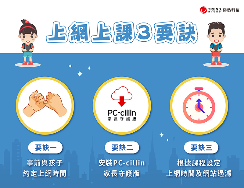 在資訊快速變化的網路環境中,家長與孩子都需要一起學習!趨勢科技分享「上網上課3要訣」,幫助親子常保持暢通良好的想法交流,共同擬定上網計畫並彼此提醒努力遵行,給予孩子在網路世界中保護自己的能力,用正確的態度面對網路世界中更多未知的挑戰。