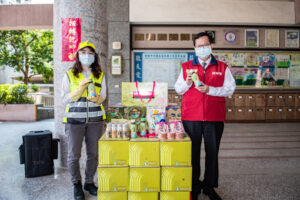鄭市長指出,桃園市防疫消毒大隊於去(109)年疫情發生之初即訓練成軍,目前編制193位防疫消毒隊員、37部消毒車及137部背負式消毒機,在部桃事件期間已執行過全市環境大消毒,具有相當經驗,相信此次也能順利完成全市環境大消毒的任務。今日鄭市長特別準備「元氣箱」,裡面包含了香米、仙草、豌豆麵、有機蔬菜等桃園各區著名農特產,致贈給防疫消毒大隊,慰勉所有隊員們的辛勞付出。