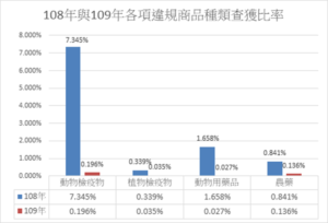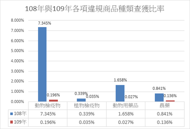 防檢局說明,109年總計搜尋83萬3,600件,其中疑似動物檢疫物1,632件、植物檢疫物292件、動物用藥品223件及農藥1,130件,共計3,277件,查獲比率分別為0.196%、0.035%、0.027%及0.136%,相較108年之查獲比率有大幅下降趨勢。防檢局進一步說明,110年1至4月網搜數量已達27萬1,400件,疑似違規商品計571件(動物檢疫物237件、植物檢疫物155件、動物用藥品65件及農藥114件),1至4月查獲比率介於0.154%至0.280%之間,相較109年同期之查獲比率明顯下降。