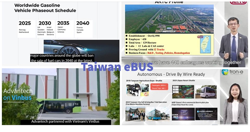 除了廠商發表電動巴士解決方案,貿協董事長黃志芳與車輛測試研究中心(ARTC) 董事長黃隆洲也共同當起台灣電動車超級業務員,於開場影片說明臺灣資通訊實力在智慧車輛時代的重要性,不論智慧影像系統、車載機都將運用許多AI演算法及物聯網的通訊系統,這些都是臺灣業者的強項。同時,臺灣企業追求比買主還高的品質,尤其是「客戶要求A,我自發做到A+」的精神、勇於投資設備與研發,使得臺灣能成功在國際電動車供應鏈佔有一席之地。此外,臺灣業者早已掌握部分關鍵技術,且累積逾千件自駕車與電動車相關專利及技轉實例,未來臺灣必能成為國際大廠快速實現切入電動車的最佳跳板。