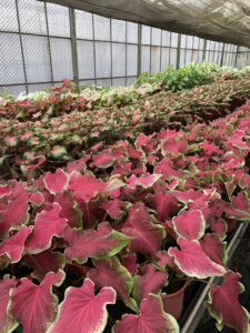 種苗場說明,彩葉芋(Caladium × hortulanum Birdsey)為天南星科多年生草本球根植物,原生於熱帶美洲,有生動的葉色和豐富的斑紋。全球種球主要產於美國佛羅里達州,依其外觀形態,可大略區分成為廣葉型及狹葉型兩種類型,廣葉型葉柄與葉片的連接點位於近葉心處,葉形呈寬廣的心臟形,株型較大,較耐蔭,適合用於樹蔭下的花壇景觀布置;狹葉型品種葉柄與葉片的連接點位於葉片基部葉緣處,葉形較細長、呈三角箭頭形,株型較小,但葉柄較短且硬挺,適合做為觀葉盆花。