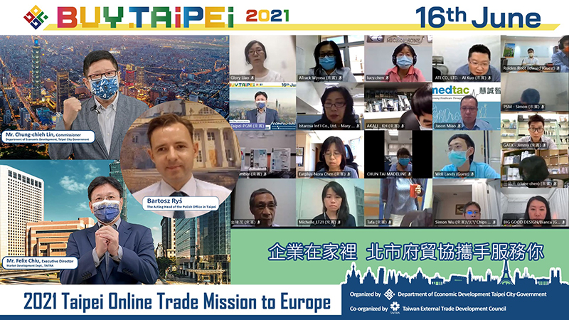 「2021年臺北市經貿拓銷計畫」首場活動「臺北市線上經貿拓銷團-歐洲」於6月16日舉辦,共27家臺北市企業參與,包含電子資通訊產業、消費性電子、智慧機械、智慧醫療、食品業者,貿協邀集來自歐洲的波蘭、烏克蘭、俄羅斯、保加利亞、羅馬尼亞、匈牙利、英國、法國、西班牙、義大利、荷蘭、德國等12國74家的買主,與我商進行145場一對一視訊洽談,創造商機1,570萬美元。貿協表示,買主中包含法國電商平台Cdiscount、俄羅斯製造業集團TATNEFT Group旗下公司等大型歐洲企業,視訊洽談自16日下午3時洽談至深夜9時半,氣氛熱絡。