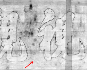 文澳城隍廟管理委員會對於廟方文物亦十分用心,於109年提出「視觀察」匾清潔維護計畫,委託國立科學工藝博物館執行。這次的大型健康檢查中,特別在清潔前為「視觀察」匾進行一次全幅的X光拍攝,透過X光照片可發現,「視觀察」下還隱藏著其他字體(圖4),可惜的是這些文字因遭強力清除而無法判斷,只能研判「視觀察」匾為舊匾新用。