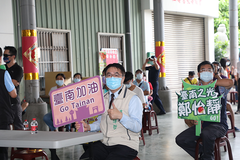 【臺南訊】今(24)日上午台灣桌球混雙的鄭怡靜和林昀儒迎戰印度,其中鄭怡靜選手出身台南市,在台南歸仁家中的鄭怡靜爸爸更號召當地鄉親,並在歸仁仁壽宮架設電視牆,一起在電視機前為鄭怡靜加油打氣。台南市長黃偉哲也親臨現場與鄭怡靜家人與在地鄉親一起觀戰,為鄭怡靜加油。