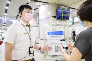 高鐵公司特別提醒旅客,目前高鐵車廂內禁止飲食並同步暫停各項推車商品販售服務,旅客若因生理需求(如喝水、服藥、哺乳)需飲食者,請遵守保持社交距離規範,並應於飲/食用完畢後,儘速佩戴口罩;商務車廂亦暫停供應熱飲,改為提供單獨包裝之甜鹹點心各1份及瓶裝水,敬請旅客將餐點攜帶下車後再行食用。各車站內之付費區及非付費區,仍維持開放旅客在與不特定人保持社交距離或有適當阻隔設備之情形下,可暫時取下口罩飲食,飲食完畢須立即戴上口罩。