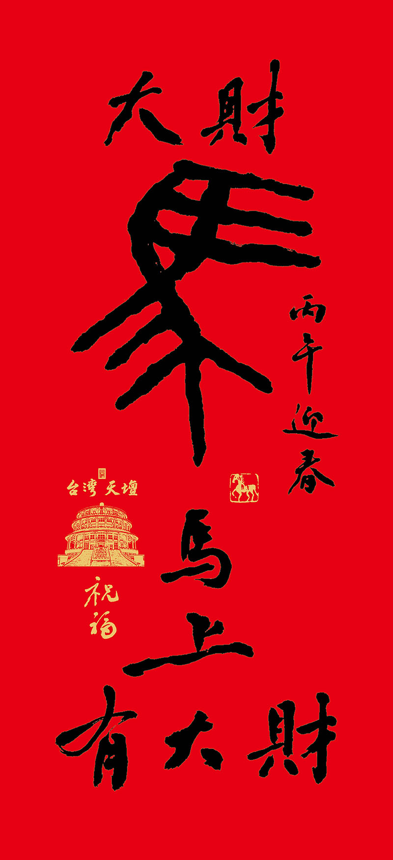 畫面上方置「大財」二字,視覺上自然形成「馬上有大財」之直觀意象;下方再以文字明書祝語,使祝福清晰可感、雅俗共賞。右側題寫「丙午迎春」,並鈐馬肖形印,以誌歲次;左側呈現台灣天壇主體意象並加蓋寶璽,象徵天壇對新歲的祝福與加持。