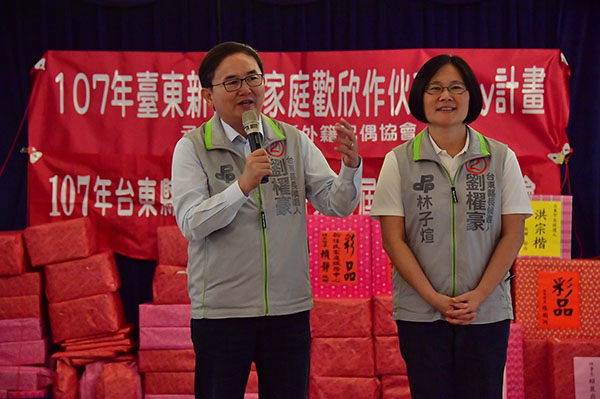 今(04)日台東縣長候選人劉櫂豪和妻子林子?,出席台東縣外籍配偶協會會員大會,逐一與現場所有的新住民及其家人朋友握手寒暄並分享他的新住民政策,受到熱烈歡迎,大讚劉櫂豪是新住民的豪朋友。劉櫂豪表示,這些新住民朋友遠渡重洋來到台灣在這裡落地生根,未來會積極協助解決他們在生活中遇到的各種問題,讓他們感受到家人般的溫暖。