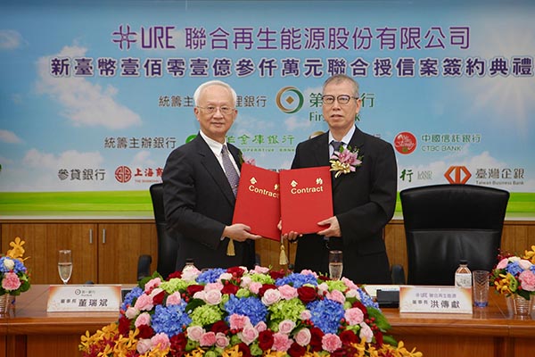 圖:第一銀行主辦聯合再生能源新臺幣101.3億元聯貸案,第一銀行董瑞斌董事長(左)與聯合再生能源洪傳獻董事長(右)共同主持完成簽約。???????