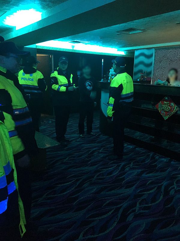 【林口警訊】為防制街頭聚眾鬥毆滋事事件,展現警察打擊犯罪決心,林口分局於3月8日夜晚規劃實施擴大臨檢勤務,針對轄內易聚集處所熱點及易滋事場所卡拉OK、夜店、快炒店及薑母鴨店等處所,實施威力臨檢以達有效遏止不法行為發生,同時向業者進行宣導並張貼「不要打架,打贏送法院,打輸送醫院」海報宣導,冀望能避免客人的鬥毆行為。