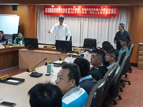 澎湖縣政府警察局為因應第15任總統、副總統選舉參選人安全維護工作任務需要,縝密強化各參選人全般安全維護工作,精實安全警衛人員訓練,提升隨護編組及安全警衛人員執勤技巧、應變能力,特由該局規劃於本(3)月26、28日8至17時,假勤務指揮中心會議室、五德人力發展中心,召集局內儲備第15任總統、副總統選舉參選人地區編組及108年地方首長、特定人士隨護警衛約50餘人,辦理是項教育訓練工作。